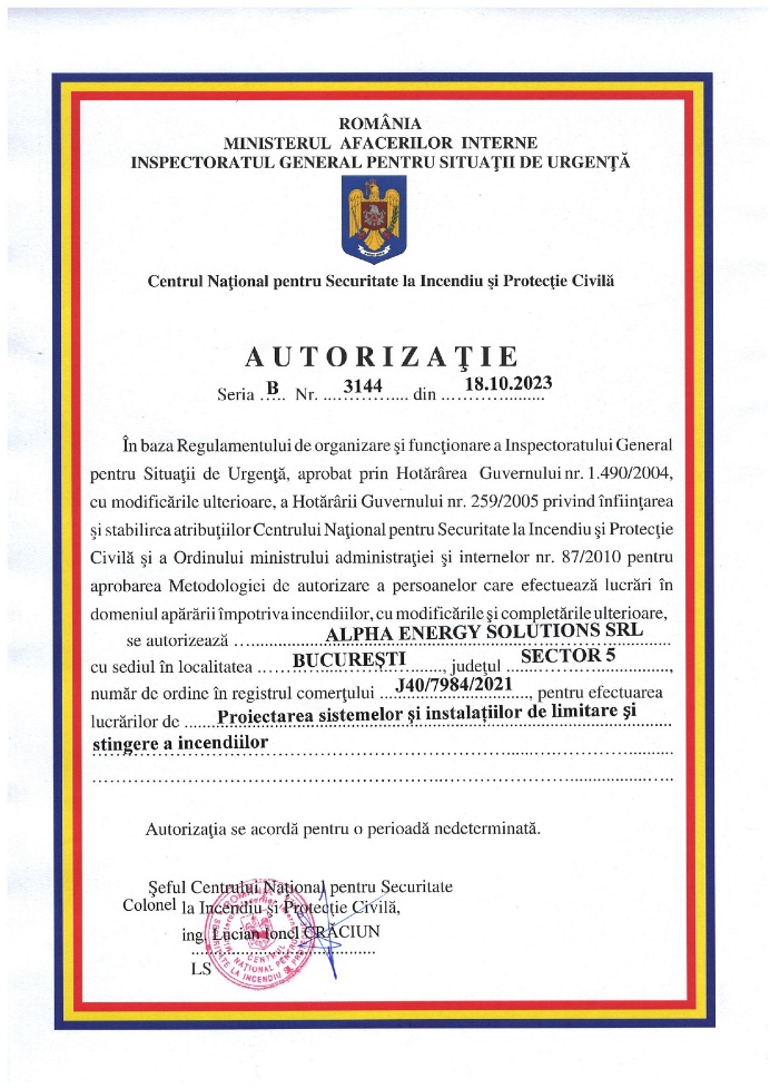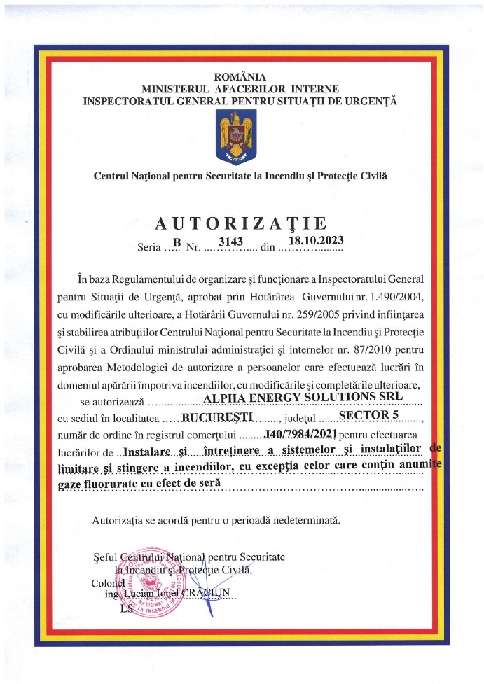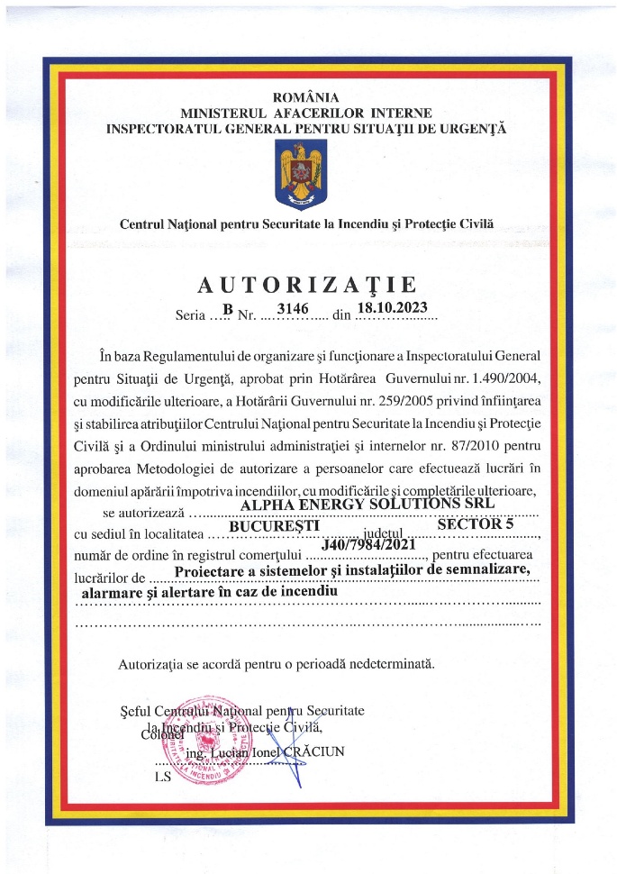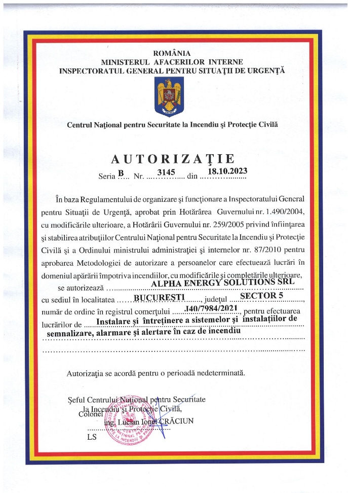 - ✅ IGSU – Instalare și întreținere a sistemelor și instalațiilor de semnalizare, alarmare și alertare în caz de incendiu