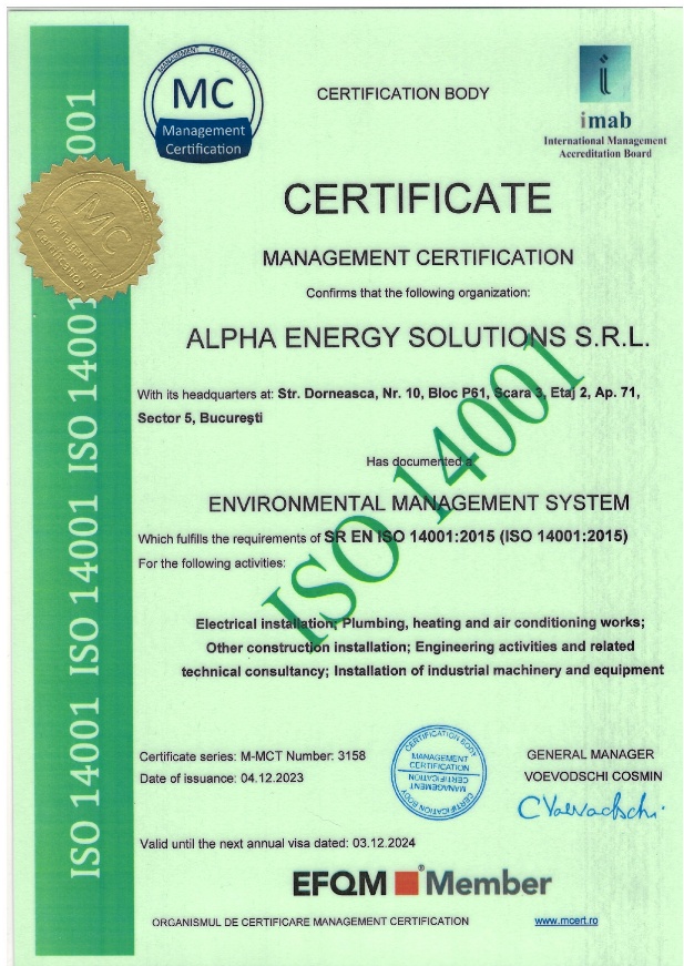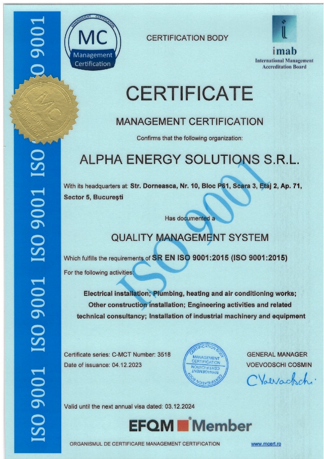 Pentru a asigura servicii de calitate, eficiente și conforme cu legislația în vigoare, firma noastră deține autorizări și certificări care atestă competențele noastre în domeniul instalațiilor electrice, instalații sanitare, instalații HVAC, sistemelor de detecție și stingere incendii, instalații de securitate.